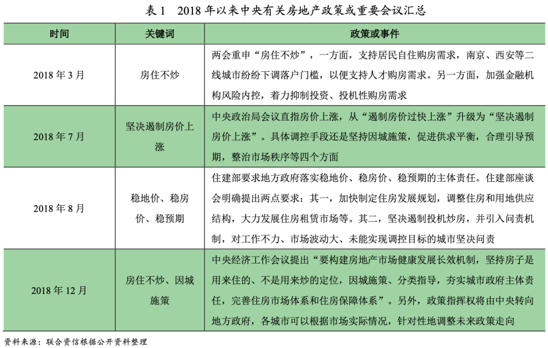 中央層面,自2016年“十一”地產調控政策周期開始,2016年12月的中央經濟工作會議首提房住不炒,2017年3月地產調控政策進一步升級,呈現了熱點城市政策出臺高頻次、調控城市覆蓋范圍廣、政策措施多維度等特征。2018年,在金融財政政策定向“寬松”的同時,房地產調控政策仍然“從緊”,繼續堅持“住房不炒”、逐步建立穩定房地產市場長效機制的調控思路,具體內容詳見表1。
