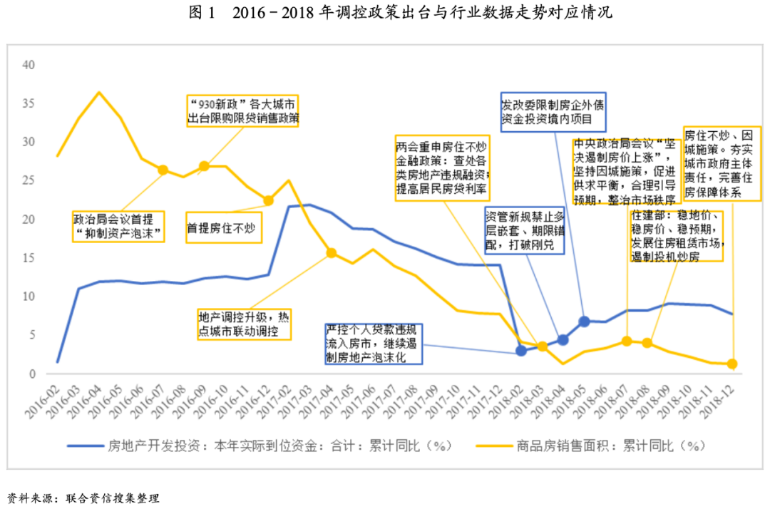 2016年房地產調控政策周期開始,2017年下半年房地產行業整體融資環境開始收緊;2018年在金融財政政策定向“寬松”的同時,房地產調控政策仍然“從緊”
