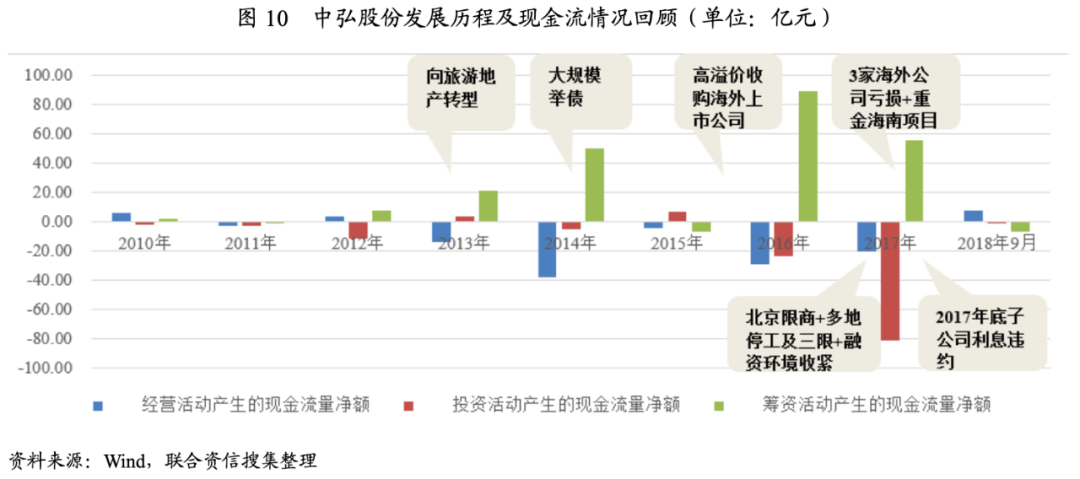 我們將中弘股份戰略轉型的時間節點和現金流情況進行對比,回顧其發展歷程我們可以發現:公司一直采取了較為激進的發展戰略,經營活動現金流持續凈流出并高度依賴外部籌資活動;2017年行業外部環境快速收緊對公司銷售及融資造成了巨大的沖擊,舉債擴張的模式難以維繼,具體情況如下圖所示。