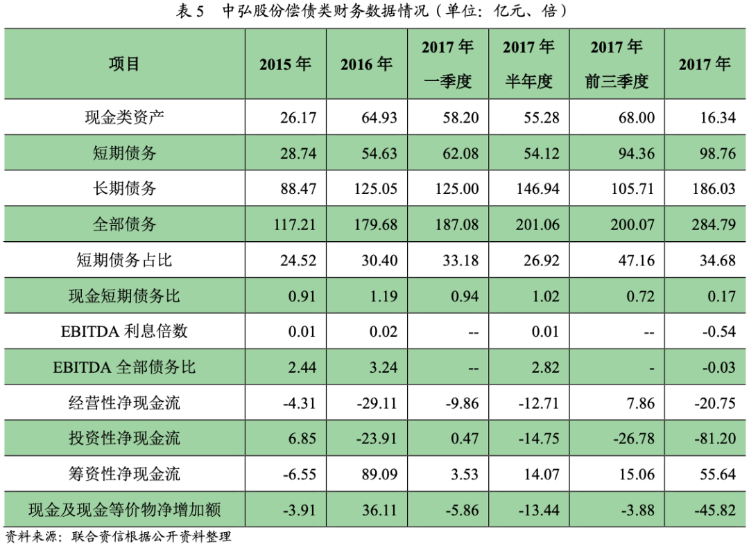 中弘股份在建及擬建項目主要為商住及文旅項目,去化速度較慢且受政策影響較大,受北京商辦類項目及海口填圍海項目政策收緊影響,中弘股份京內商住項目及海南如意島等項目銷售停滯;疊加中弘股份因經營不善致使山東及浙江等地的多個項目處于停工狀態,2017年以來銷售額大幅下滑,經營性現金流對業務支撐不足。受銷售大幅下降影響,中弘股份現金類資產大幅下滑且現金短期債務比處于極低水平,中弘股份的資金鏈已經極其緊張。