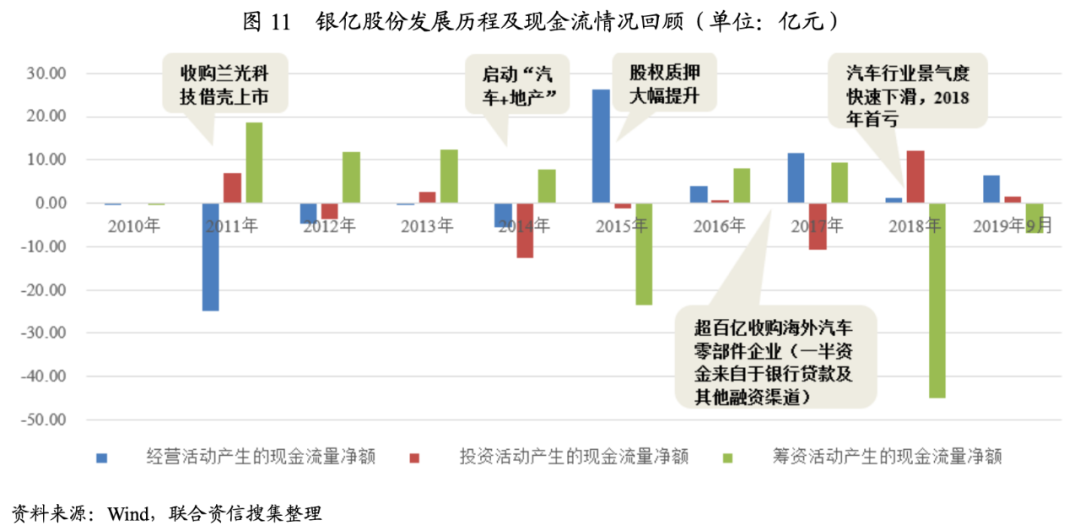 我們將銀億股份戰略轉型的時間節點和現金流情況進行對比,回顧其發展歷程我們可以發現:公司自2014年開始啟動“汽車+地產”的多元化策略,2015年開始進行大量股權質押以應對2016年開始的大額海外汽車零部件企業收并購舉動;但公司錯過了地產的快速發展期,并在大額投入后迎來了汽車行業的快速下滑,并于2018年出現首虧,當年融資能力快速下滑,爆發債務違約危機,具體情況如下圖所示。