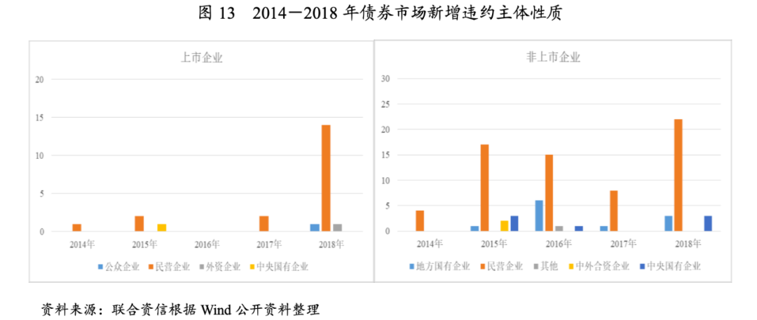 2014-2018年,非上市違約主體共87家,以民營企業為主,地方國有企業和中央國有企業也存在違約現象;上市主體的違約數量遠低于非上市主體,其中2018年上市主體違約數量16家,遠超以前年度,主要系2018年A股市場大幅下跌,且部分上市公司股票質押比例過高,面臨爆倉風險,影響再融資能力所致。