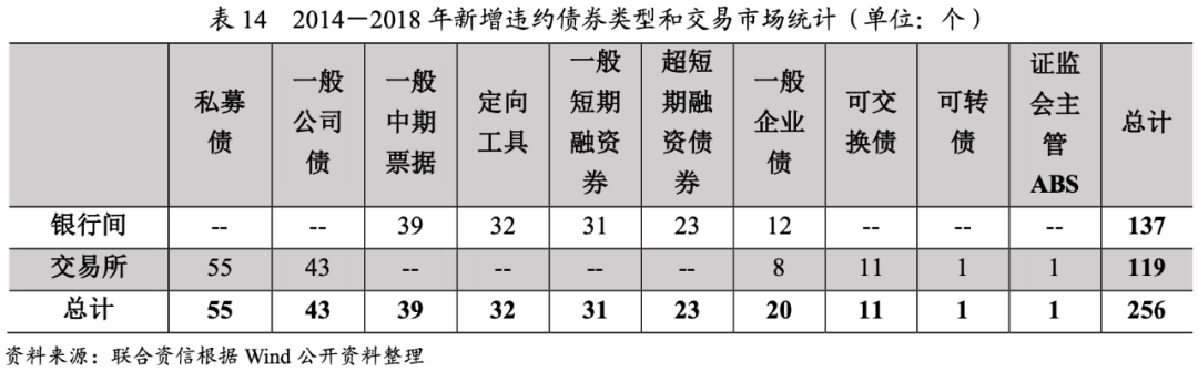 各年份違約主體違約前信用評級呈現明顯的遷移態勢,2014年違約主體的信用評級較低,或無信用評級,隨后違約主體信用級別逐漸升高和分散化,直至2017年,級別最高的違約債券違約前主體信用評級提高至AA+,2018年,幾乎各個級別都出現了違約情況。