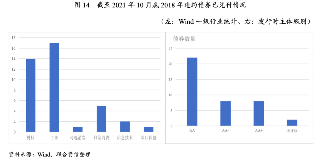 從債券違約回收率來看,指債券首次違約之后的償付情況,具體公式:違約回收率=(兌付本金+兌付利息)/(違約本金+違約利息)。截至2021年10月底,2018年違約的256只債券,平均違約回收率為16.70%,其中40只債券違約回收率為100%,這40家企業行業較為分散,但所處行業為工業和材料行業且發行時主體級別為AA的企業債券回收情況較好。從企業性質來看,債券回收率為100%的企業中,30家為民營企業,10家為地方國有企業和中央國有企業。