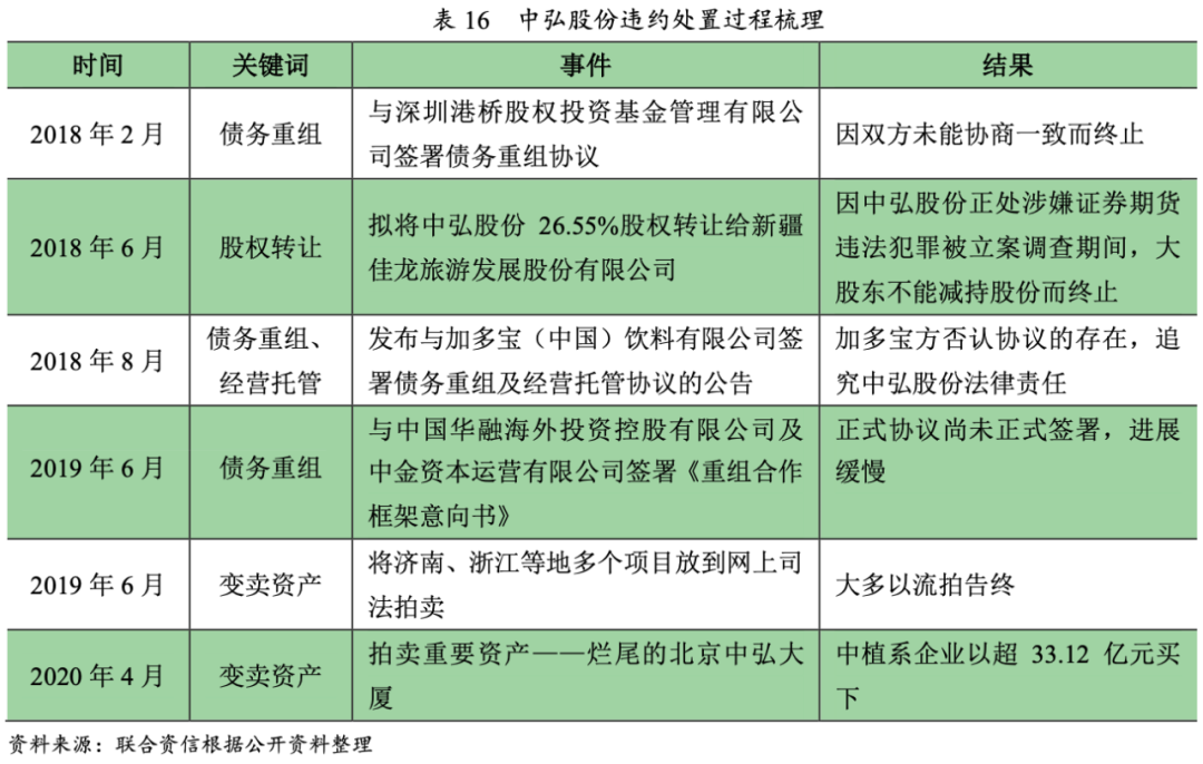 總結:違約后,中弘股份雖積極采取債務重組等多種方式自救,但重組進度極為緩慢,最終能否成功仍存在較大不確定性。目前中弘股份在建房地產項目均處于停工狀態,仍有大量債務本息逾期和訴訟、仲裁事項未能解決,最終能否順利解除債務危機仍無定論。