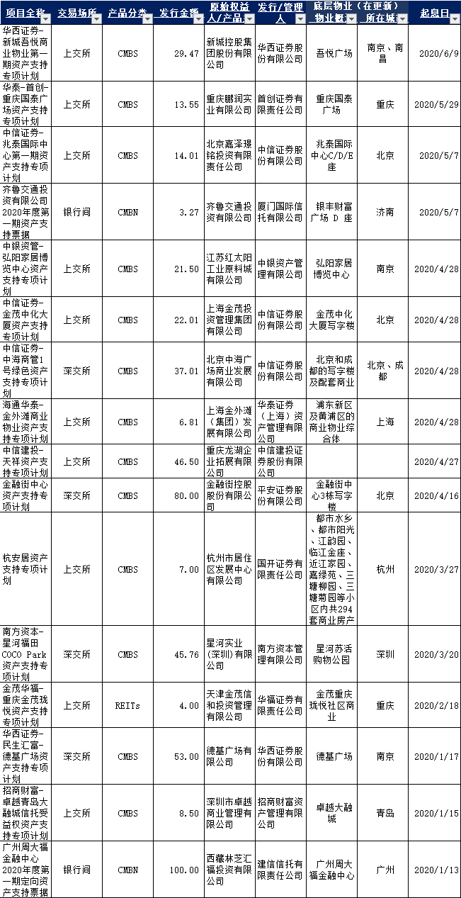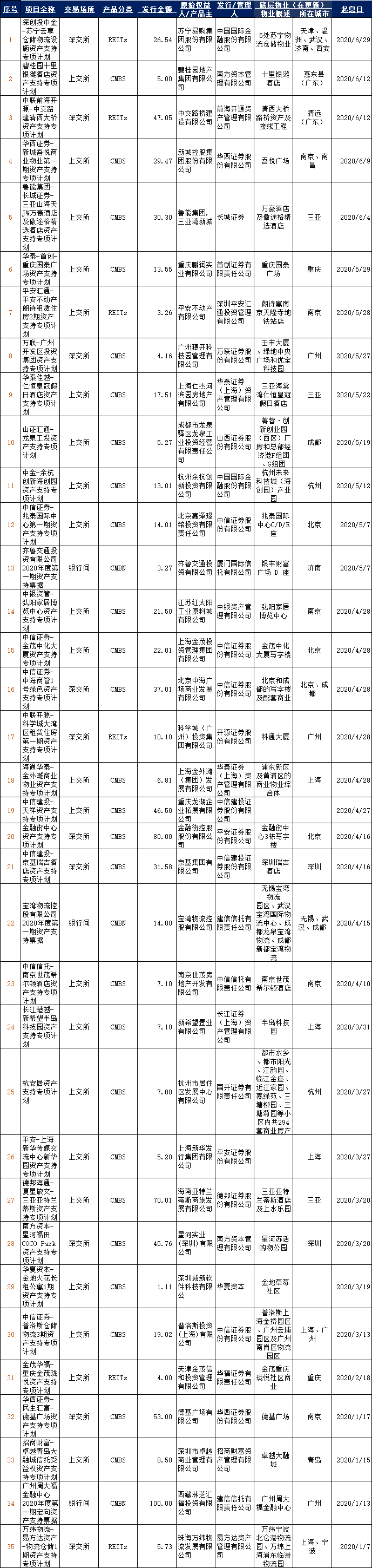 2020年1月1日至2020年6月30日,國(guó)內(nèi)已發(fā)行CMBS/類REITs產(chǎn)品35單,總規(guī)模815.44億元,其中類REITs產(chǎn)品6只、CMBS產(chǎn)品29只。