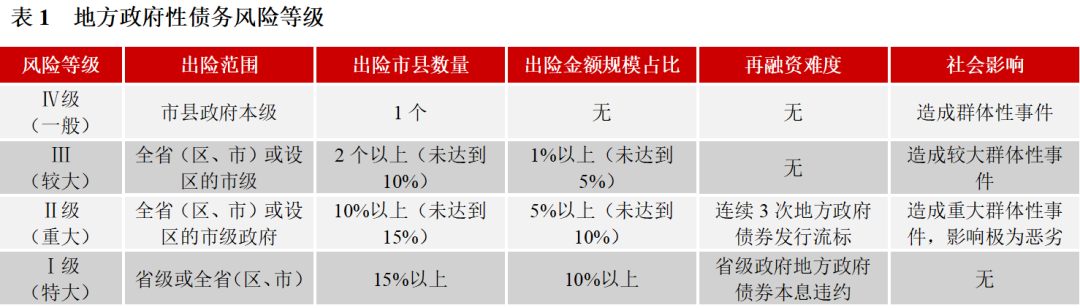 根據88號文,按照政府性債務風險事件的性質、影響范圍和危害程度等情況,劃分為Ⅰ級(特大)、Ⅱ級(重大)、Ⅲ級(較大)、Ⅳ級(一般)四個等級,其中,事件性質包括本息實質性違約、因兌付政府債務本息導致無法保障必要的基本民生支出和政府有效運轉支出、地方政府債券流標和地方政府債券實質性違約。本文將具體量化指標分為出險范圍、出險市縣數量、出險金額規模、再融資難度、社會影響五個方面來。分級處置機制是動態的、日常的,當政府性債務風險事件等級隨時間推移有所上升時,按照升級后的級別處置,同時,分級處置將推動政府加強日常流動性管理,避免出現因流動性管理不善導致政府性債務違約,觸發財政重整條件。