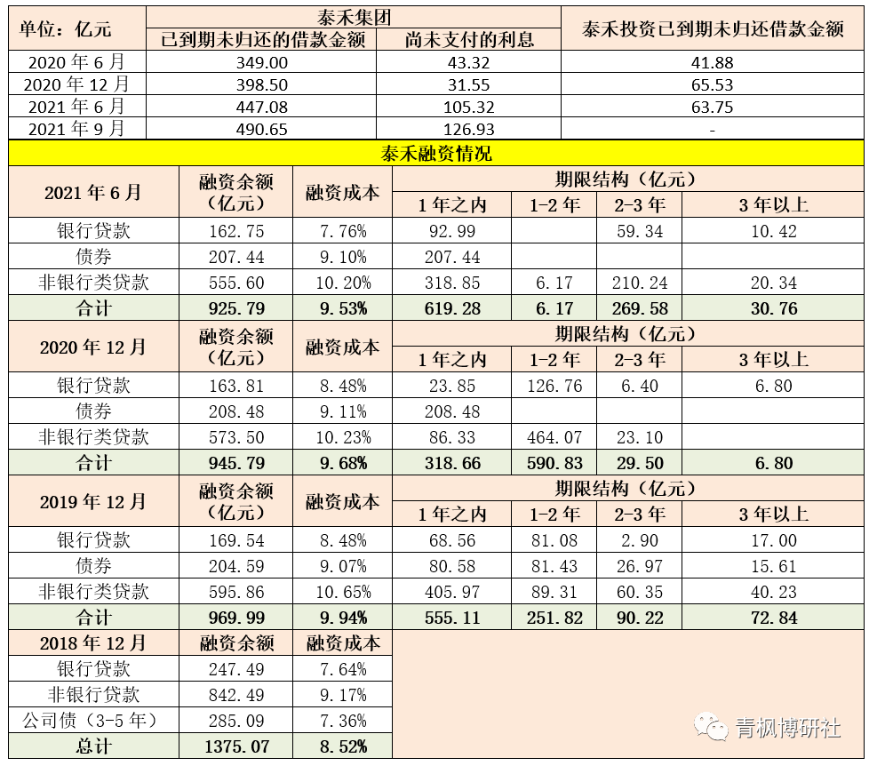根據泰禾披露的信息,截至2021年6月底,泰禾系的融資余額達到925.79億元,融資成本平均為9.53%。其中,銀行貸款余額為162.75億元,融資成本為7.76%;債券余額為207.44億元,融資成本為9.10%;非銀行類貸款余額為555.60億元,融資成本為10.20%;1年內到期的融資余額達到619.28億元。