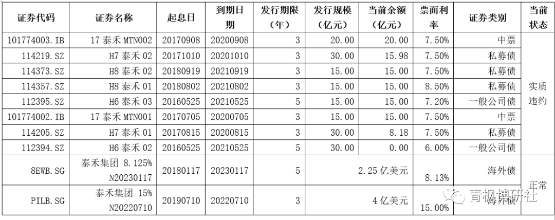 (三)公開債券:7只境內債全部違約,兩只海外債尚還正常