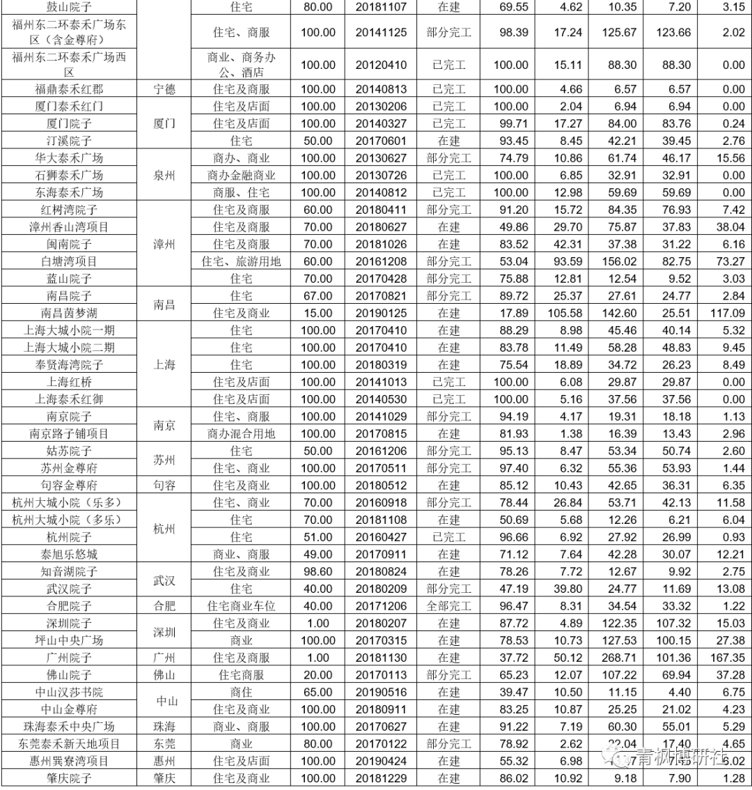 可以看出,在泰禾系的融資結構中,非銀行類貸款(應主要指信托)占比最高,融資成本亦明顯偏高,這也從側面反映出泰禾的債務壓力比較大。雖然這兩年泰禾已沒有再披露其往來金融機構情況,但從其2019年半年報披露的信息看,泰禾的往來銀行主要有大連銀行、民生銀行、上海銀行,往來非銀行機構主要有長城資產管理、四川信托、華能貴誠信托、中建投信托等。