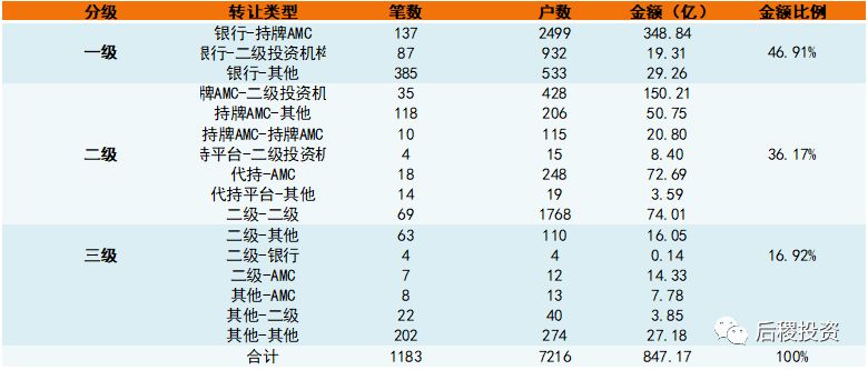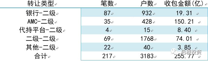 注:我們以行業(yè)內(nèi)慣例將不良資產(chǎn)行業(yè)上中下游市場分成三級。銀行端出包為一級市場;持牌機構(gòu)出包、收包為二級市場;剩下為三級市場,另外一些小眾的轉(zhuǎn)讓交易為方便統(tǒng)計也歸為第三級市場。同時,我們把成交3筆及以上或單筆債權(quán)成交10戶及以上的機構(gòu)劃為二級投資機構(gòu),成交3筆以下或單筆債權(quán)成交10戶以下為其它。
