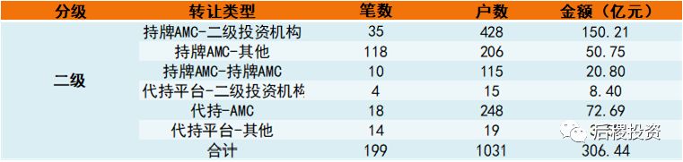 根據(jù)已有數(shù)據(jù)顯示,二級市場共出包306億余元,AMC出包占二級市場的70%,代持平臺占二級市場的30%,持牌AMC保持著較高活躍度。成交規(guī)模最大的為持牌AMC出讓給二級投資機構(gòu)的資產(chǎn)包,成交金額占比在二級市場中占48.7%,在全年總成交額中占17.7%。