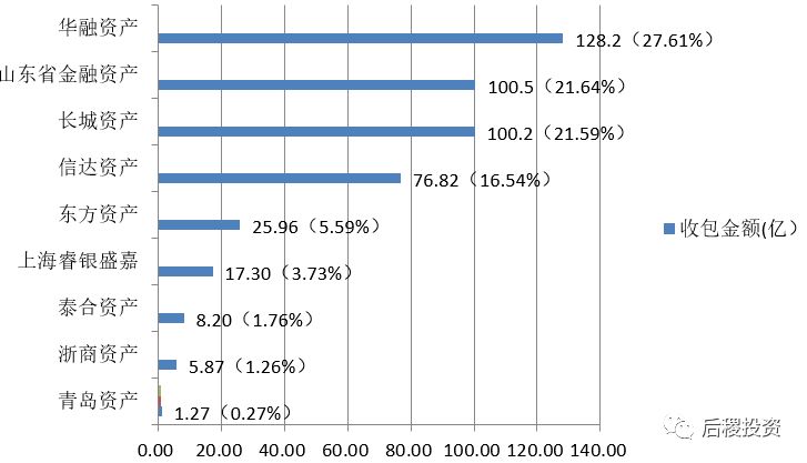 收包中,國有四大AMC和山東金融資管出包活躍,收包金額最大的為華融資管,占AMC收包總額的27.61%。