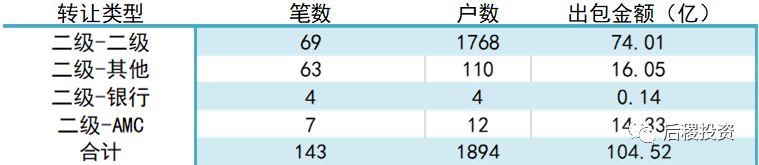 根據(jù)已有數(shù)據(jù)顯示,三級市場共出包約141億,二級投資機構(gòu)出包占三級市場近74%,其他散戶占三級市場約26%。成交規(guī)模最大的為二級投資機構(gòu)之間的出讓,成交金額占比在三級市場中占52.4%,二級投資機構(gòu)之間的出包與收包為三級市場的主力軍。