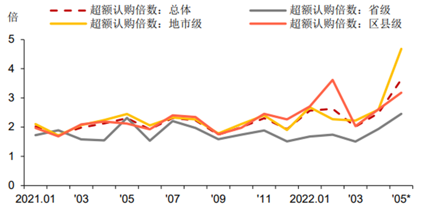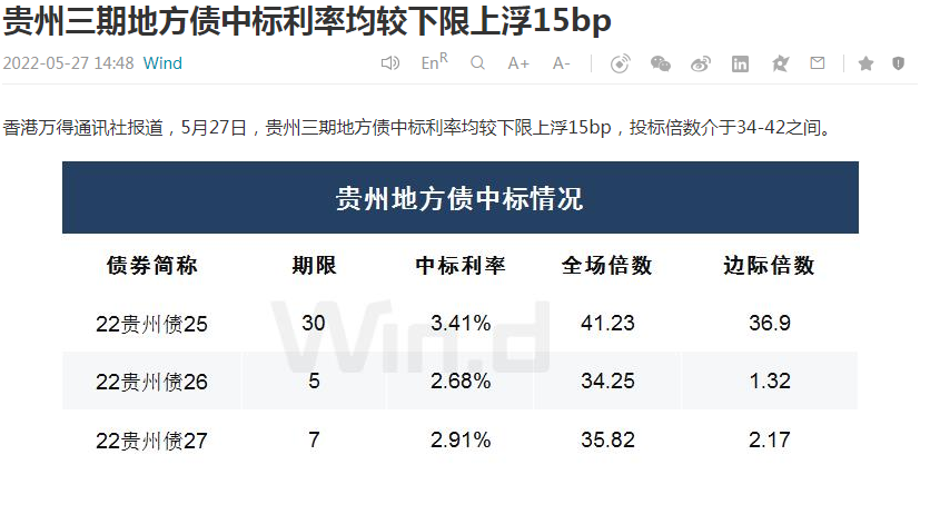無獨有偶,5月27日,貴州三期地方債中標(biāo)利率均較下限上浮15bp,投標(biāo)倍數(shù)介于34-42之間。數(shù)據(jù)顯示,22貴州債25/26/27(對應(yīng)期限30/5/7)的全場認購倍數(shù)為41.23/34.25/35.82。