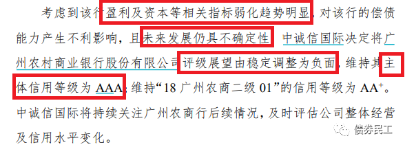 根據wind披露的公告信息,2021年4月19日,中誠信國際將廣州農村商業銀行股份有限公司(以下簡稱“廣州農商行”)的評級展望調整為負面,維持主體信用評級AAA。評級展望調整為負面的主要原因是盈利指標弱化趨勢明顯、未來發展存在不確定性。