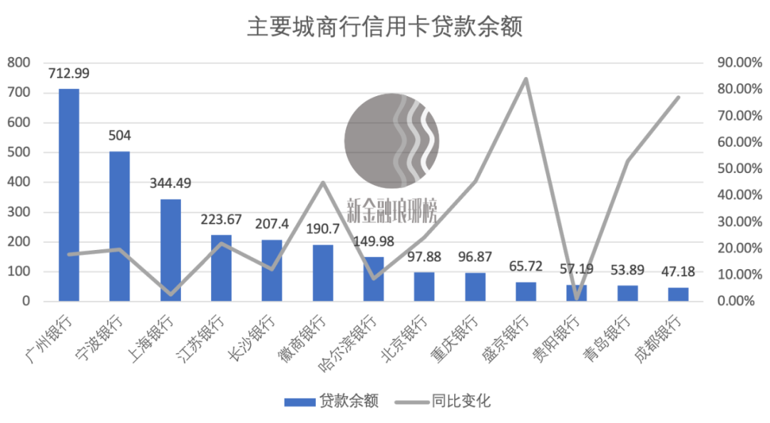從信用卡貸款余額來看,僅有不到10家城商行超過了100億元。截至去年末,廣州銀行以712.99億元位列榜首,寧波銀行也達到了504億元,發卡量最高的上海銀行排在第三位,貸款余額為344.49億元。