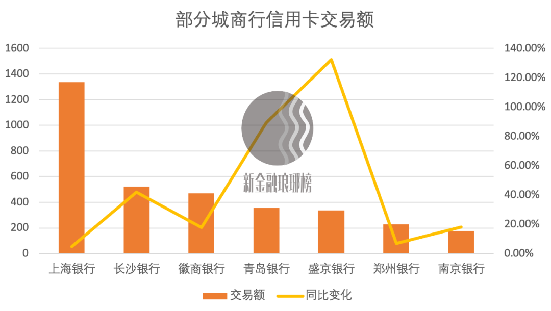 在新金融瑯琊榜統計的25家城商行中,披露了信用卡交易額的僅有7家。上海銀行遙遙領先,也是唯一一家全年信用卡交易額超過千億元的城商行。
