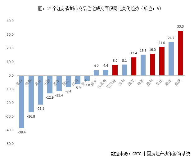 具體來看,各區域樓市表現卻大相徑庭,以往表現強勢的環滬蘇南城市普遍成交表現不振,相反經濟發展較為落后的蘇北城市卻逆勢大漲,諸如鹽城、淮安等異軍突起。據CRIC監測數據顯示,17個江蘇省城市商品住宅成交面積同比漲幅前列幾乎被蘇中和蘇北城市包攬,鹽城、徐州、淮安等蘇北強三線城市同比漲幅均超10%,其中鹽城同比漲幅更是超30%。此外,徐州商品住宅成交面積近1500萬平方米、淮安學區房帶動房價“三級跳”等高光表現比比皆是。與之形成鮮明對比的是蘇南城市普遍同比回落,其中昆山同比回落近4成位列跌幅第一,其余蘇南城市均有不同程度回落,同比正向增長的寥寥無幾。