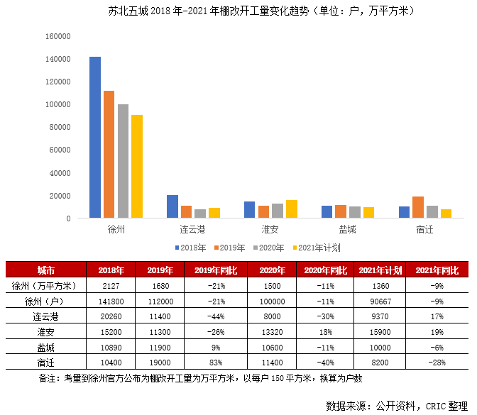 一是棚改正當時,擴充本地居民購力。雖然2020年正處全國棚改收官年,但蘇北諸市的棚改貨幣化安置卻方興未艾,以徐州為例,近年來棚改開工量均在千萬方級,2019年更是新開工量1700萬平方米位列全國第一,是唯一連續入選國家激勵名單的棚改城市,其余四城棚改開工套數普遍在8000-20000戶區間。