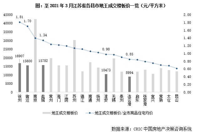 二是“三條紅線”客觀約束下,房企投資聚焦強三線,也使得蘇北城市土拍競爭愈發激烈,加劇居民購房上漲預期。2020年下半年起蘇北五城“地王”頻出,徐州、鹽城和宿遷土地最高成交樓板價分別達到1.69萬元/平方米、1.58萬元/平方米和1.56萬元/平方米,已超過絕大多數省內城市。這也是刺激短期內需求集中爆發的直接導火線。