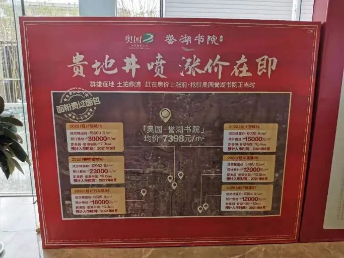 值得關注的是,蘇北部分城市在售樓盤也將周邊“地王”作為賣點,向客戶傳導房價上漲預期。譬如淮安的金輝優步東郡、宿遷的奧園譽湖書院都在售樓處打出了類似標識,房企“科普”地價驅動房價上漲預期,恐慌性購房現象在所難免。