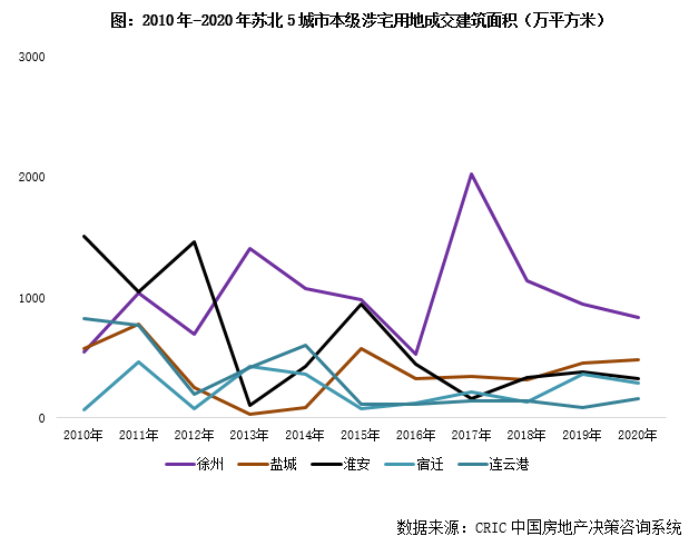 事實上,近五年蘇北5城土地成交規模維持較高規模,合計年均超2000萬平方米。以5城市本級為范圍限定,2018年后5城涉宅用地成交規模較2015年以前略有下降,但合計年成交規模仍超2000萬平方米。不同區域存在顯著的差異:宿遷、連云港自2013-2014年高點之后,便開啟低位徘徊;鹽城、淮安回調幅度不及宿遷、連云港,年成交量分別在500萬方和300萬方高位持穩,徐州土拍放量最為明顯,即便2017年成交縮量,也高位持穩1000萬平方米。