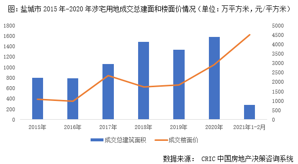 從CRIC監測數據來看,2015-2017年鹽城土地成交量低位徘徊,年成交量基本都在800-1000萬平方米左右波動,2018-2020年以來,隨著鹽城政府棚改力度的逐步加大,全市涉宅用地成交量大幅增加,2018-2020年年成交量均在1500萬平方米左右高位持穩,2021年1-2月涉宅用地成交量也達283萬平方米,同時伴隨著品牌開發商相繼入駐,成交樓面價自2019年穩步上揚,2021年前2月已突破4500元/平方米。