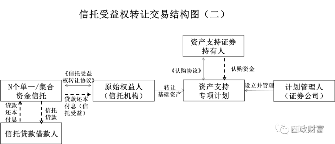3.信托機構與專項資管計劃管理人簽署《信托受益權轉(zhuǎn)讓協(xié)議》,將信托受益權作為基礎資產(chǎn)轉(zhuǎn)讓給專項計劃并設立ABS;