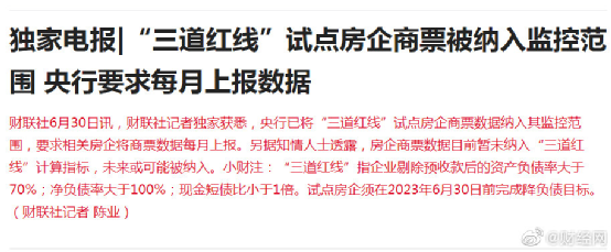 據(jù)財(cái)聯(lián)社6月30日消息,央行已將“三道紅線”試點(diǎn)房企商票數(shù)據(jù)納入其監(jiān)控范圍,要求相關(guān)房企將商票數(shù)據(jù)每月上報(bào)。