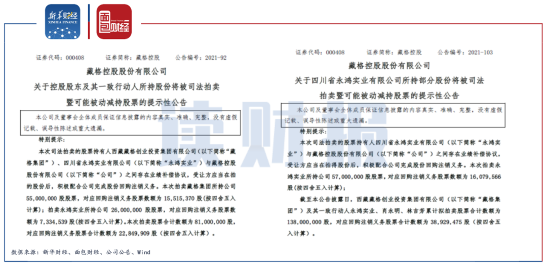 雖然藏格控股的業績大幅增長,但由于此前重組時未完成業績承諾,公司控股股東及其一致行動人合計將有1.38億股公司股票被司法拍賣,其拍賣所得款項全部用于歸還債務。