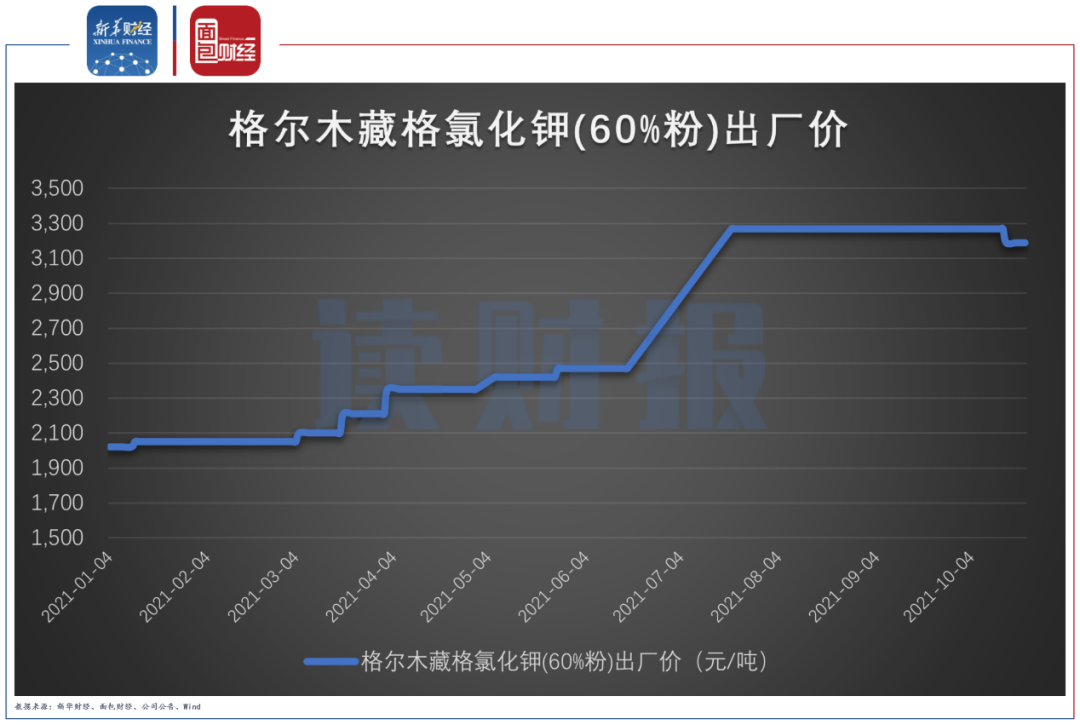 數據顯示,截至9月30日,藏格控股全資子公司格爾木藏格氯化鉀(60%粉)的出廠價為3270元/噸,較年初的2020元/噸相比增長了61.88%。2021前三季度藏格控股生產氯化鉀68.18萬噸,銷售66.75萬噸。