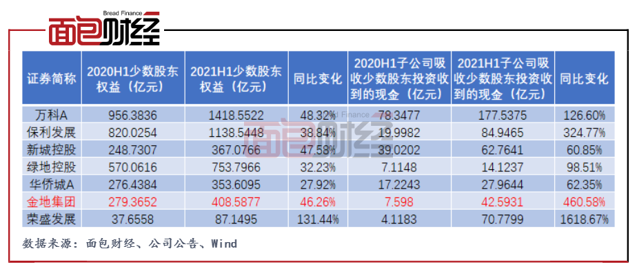 不僅僅是金地集團,在房地產企業融資環境趨緊的背景下,通過吸收少數股東投資來融資的操作在房企中越來越普遍。比如萬科截至上半年末少數股東權益為1419億元,同比增加逾48%,由子公司吸收少數股東投資收到的現金為178億元,同比增加近127%;榮盛發展截至上半年末少數股東權益為87億元,同比增加逾131%,由子公司吸收少數股東投資收到的現金為71億元,同比增加近1619%。