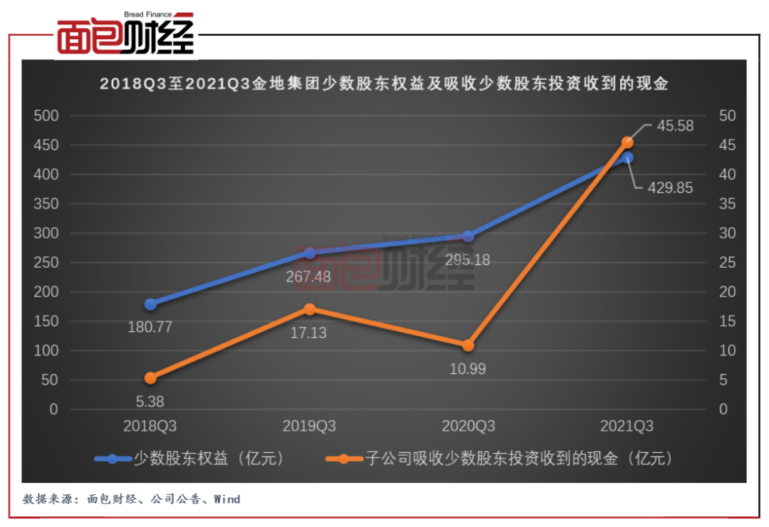 圖4:2018Q3至2021Q3金地集團少數股東權益及吸收少數股東投資收到的現金