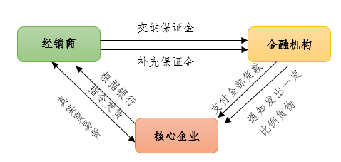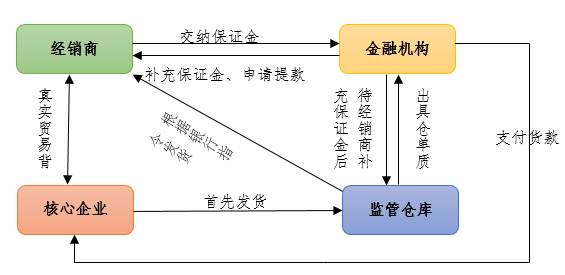 先票(款)后貨模式是貨權質押授信業務的一種,通過存貨質押引入核心企業信用,銀行給經銷商融資,預付款給核心企業,核心企業發貨給銀行指定的倉儲監管企業,貨入庫后立即設定質押監管,作為銀行授信的擔保,倉儲監管企業根據銀行的出庫指令逐步放貨給經銷商。
