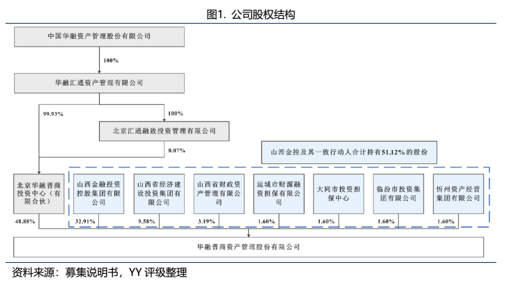 公司成立于2016年,是山西省內第一家地方資產管理公司,由中國華融與山西省政府共同組建。初始注冊資本為30億元,中國華融和山西省政府分別持股51%和49%;2019年12月原股東之一的山西金融投資控股集團增資1.3億股,注冊資本增至31.30億元,中國華融的持股比例下降至48.88%,山西省股東簽署《一致行動人協議》,山西金控及其一致行動人合計持有華融晉商51.12%的股份。