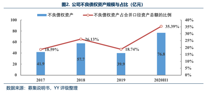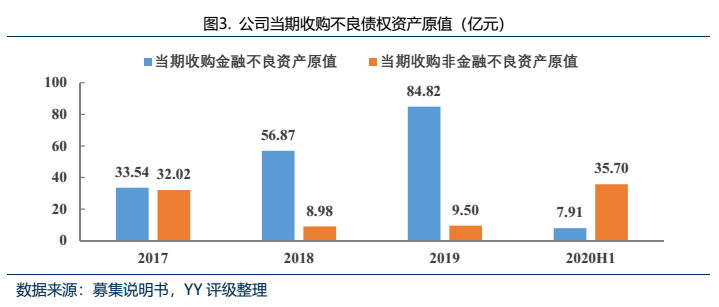 來自非金融企業的不良資產項目截至2020年6月末共10個,比2019年末新增了4個項目。2020年上半年,受疫情影響,公司非金融類企業不良債權收購規模大幅增加,原值為35.70億元;一方面經濟下行使得不良資產的供給增加、收購成本降低,但另一方面需關注債務人信用風險的上升對不良資產回收金額和時間不確定性的影響。