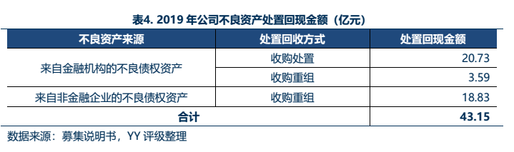 不良資產處置方式與效率來看,處置方式上,公司處置回現金額中通過收購處置(包括公開轉讓、訴訟追償、委托清收等)和收購重組兩種方式的占比相對均衡,這也與公司不良資產中來自金融機構和非金融企業的占比大體一致。具體情況如下表所示: