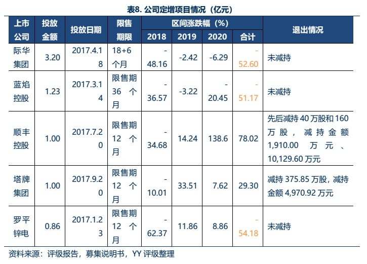 可以看出,除了順豐控股和塔牌集團的股票價格走勢較好之外,其他幾家2018-2020年的累計跌幅均超過了50%,股票價格低于定增價格。總體而言,公司投放的股票定增項目表現平平,累計收益情況不佳,后續退出情況需關注股票市場走勢。