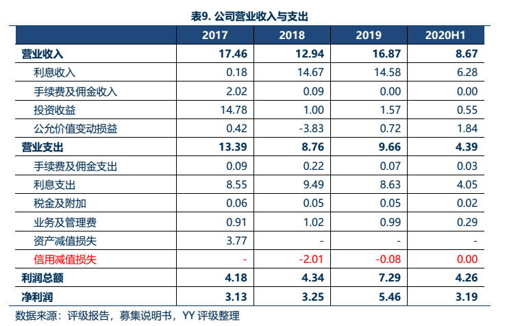 公司收入來源包括利息收入、手續費及傭金收入、投資收益以及公允價值變動損益,利息收入(包括信托貸款、委托貸款和收購非金融機構的不良資產包產生的利息收入)為公司最主要收入來源(2018年新會計準則下,債權投資產生的收益計入利息收入)。2019年利息收入14.58億元,其中債權投資產生的利息收入14.34億元,其余為銀行存款利息。從業務細分看,新會計準則下投資收益主要來自收購和處置金融機構的不良資產以及長期股權投資產生的投資收益,前者占比約90%。公允價值變動損益在不同年份之間的波動較大,2018年受二級股票市場影響,股價下降幅度較大,對營業凈收入形成拖累。