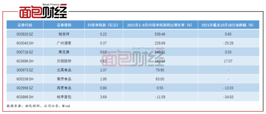 在屬于申萬烘焙食品行業分類的8家公司中,桃李面包是第一家披露三季報的企業。對比這些企業今年上半年的業績表現,桃李面包的歸母凈利潤增速排名墊底。