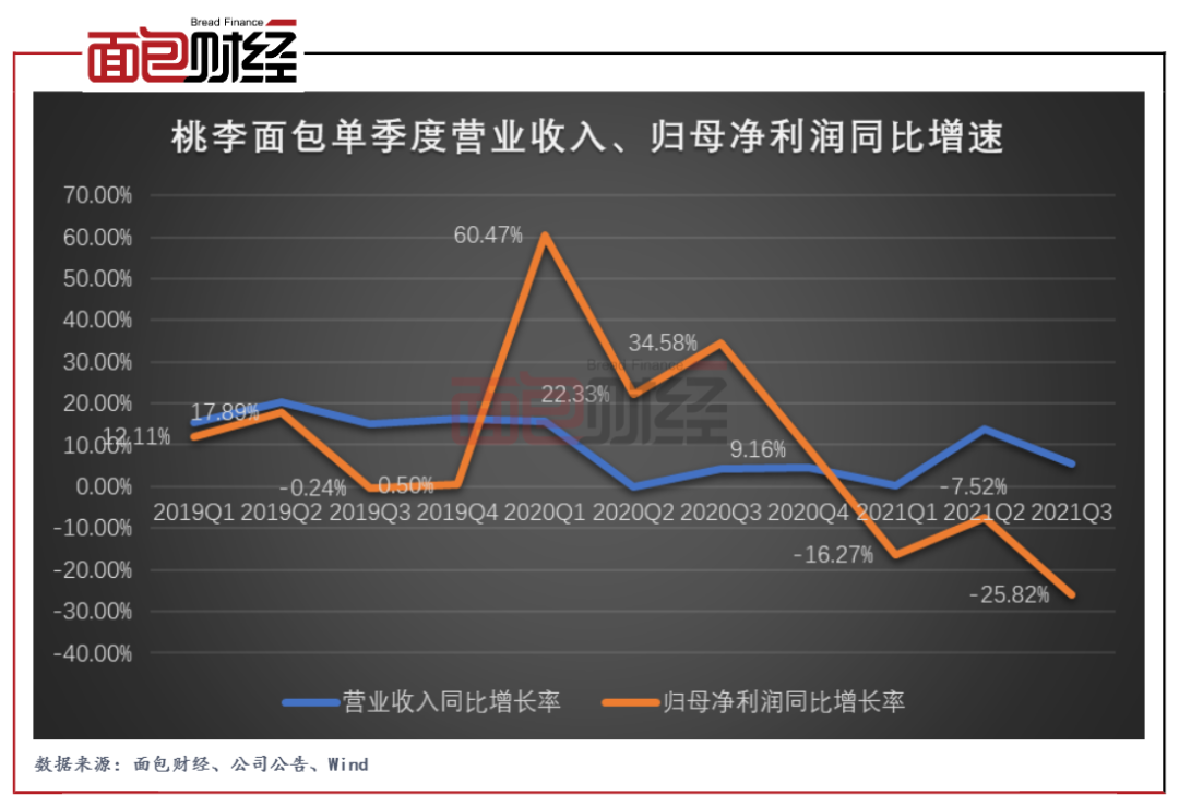 圖3:2019Q1至2021Q3桃李面包單季度營業收入、歸母凈利潤同比增速