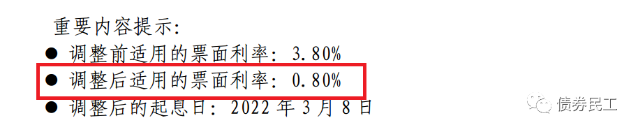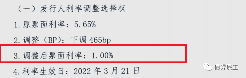在此之前,債券民工關(guān)注到的票面利率調(diào)整最低的是某城投公司的中期票據(jù),3+2年期的債券在行權(quán)時,將后2年的票面利率調(diào)整為1%。