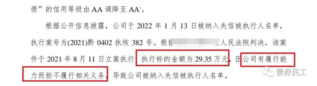 根據評級公司于2022年1月20日披露的公告,某城投公司因為執行標的金額為29.35萬元的案件有履行能力而拒不履行相關義務,于2022年1月13日被納入失信被執行人名單。