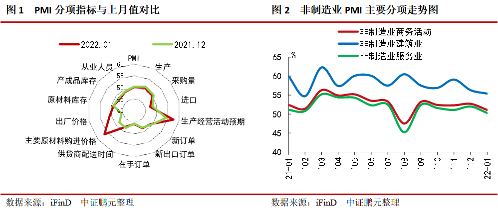 1月份,中國制造業采購經理指數(PMI)為50.1%,前值為50.3%,回落0.2個百分點;非制造業商務活動指數為51.1%,較前值回落1.6個百分點;綜合PMI產出指數為51.0%,較前值下降1.2個百分點。