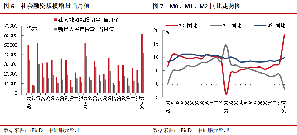 2022年1月社會融資規模增量為61,700億元,前值為23,682億元,比2021年同期多增9,816億元,比2020年同期多增1.12萬億元。社融存量增速10.5%,前值10.3%,已連續三個月回升。M2同比9.8%,前值9.0%;M1同比-1.9%,前值3.5%。先看社融的結構: