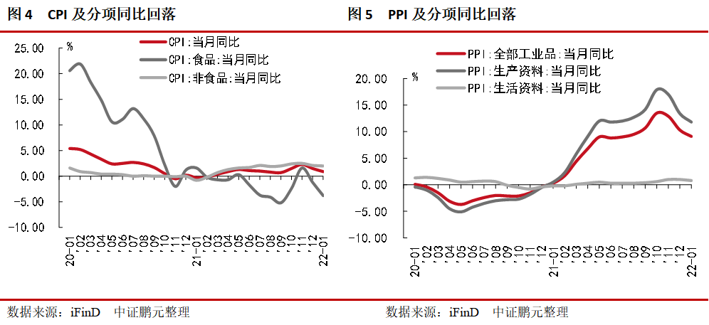 1月PPI同比上漲9.1%,漲幅比上月回落1.2個百分點。其中,生產資料價格上漲11.8%,漲幅回落1.6個百分點;生活資料價格上漲0.8%,漲幅回落1.6個百分點。從PPI環比來看,保供穩價政策有力推進,煤炭、鋼材價格繼續回落,煤炭開采和洗選業價格下降3.5%,黑色金屬冶煉和壓延加工業價格下降1.9%。受國際原油價格回升影響,國內石油相關行業價格回暖。石油和天然氣開采業價格由上月下降6.9%轉為上漲2.6%;化學原料和化學制品制造業、化學纖維制造業價格分別下降1.3%和0.1%,降幅比上月分別收窄0.8和3.0個百分點國際有色金屬價格上行,帶動國內有色金屬冶煉和壓延加工業價格上漲0.8%。