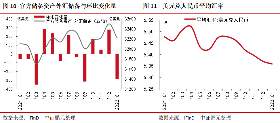 1月外匯市場運行總體延續平穩態勢,境內外匯供求呈現基本平衡。外匯儲備規模為32,216億美元,較2021年末下降285億美元,降幅為0.88%。1月,美元兌人民幣平均匯率為6.36,連續6個月小幅回落。