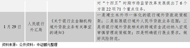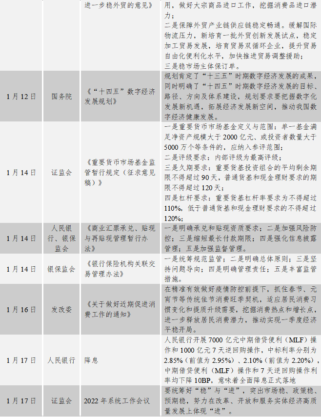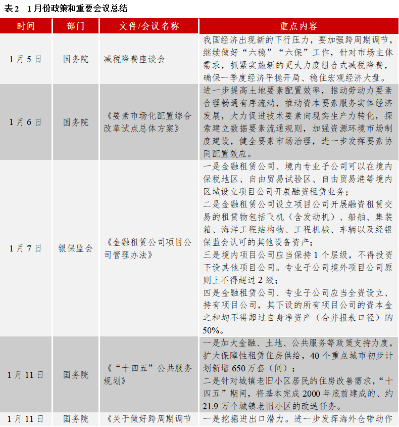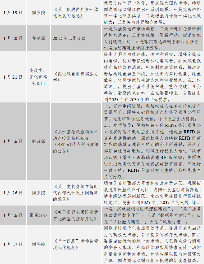 宏觀經濟設計方面:1月6日,國務院印發了《要素市場化配置綜合改革試點總體方案》,要求加強資源環境市場制度建設,健全要素市場治理,進一步發揮要素協同配置效應。本月出臺了一系列穩增長的政策和措施:國務院分別印發了《關于做好跨周期調節進一步穩外貿的意見》、《關于促進內外貿一體化發展的意見》,對我國外貿進一步發展提出要求;發改委聯合相關部門分別印發了《關于做好近期促進消費工作的通知》、《促進綠色消費實施方案》,對促進消費和綠色消費的措施進行了明確。1月,國務院分別印發了多份“十四五”發展規劃:《“十四五”數字經濟發展規劃》、《“十四五”公共服務規劃》、《“十四五”市場監管現代化規劃》、《關于支持貴州在新時代西部大開發上闖新路的意見》。