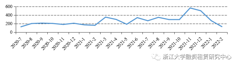 融資租賃公司公開市場直接融資總額較上月有明顯下降。據不完全統計,2021年2月共有22家融資租賃公司開展公開市場直接融資